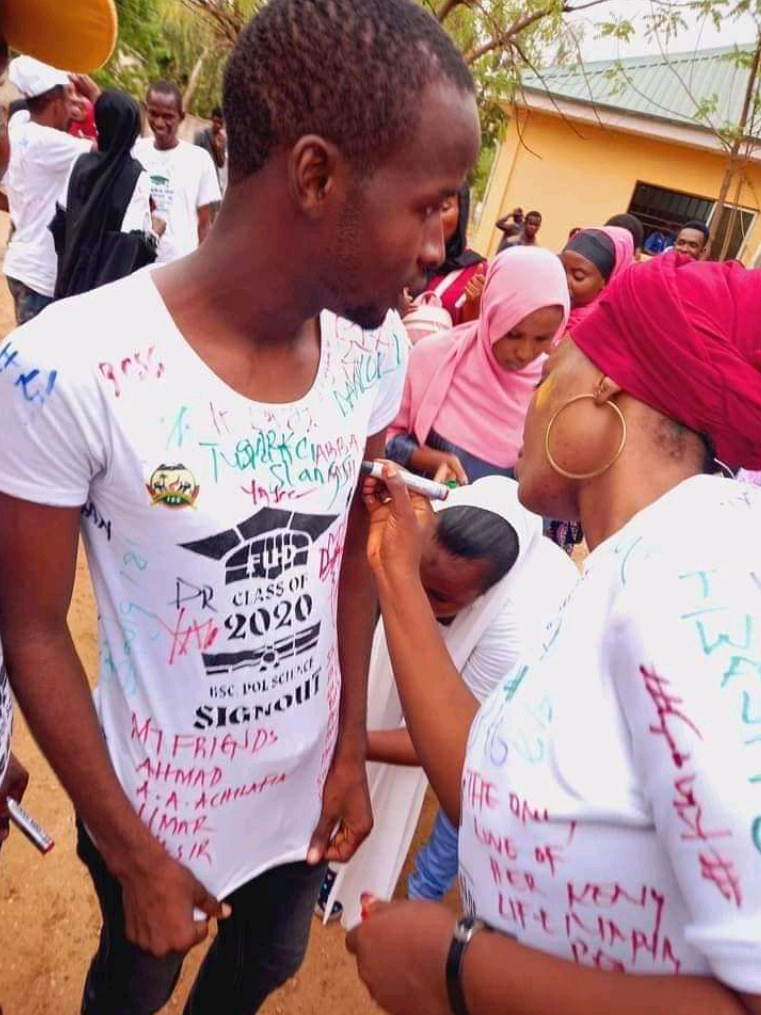 The tradition of Nigerian University students during their graduations which is popularly known as sign-out. Every graduating student will wear a white T-shirt and other students will be writing their names on the T-shirt for future remembrance has now turned into another direction of romancing with ladies, holding their body and writing names, some even hold their breasts in order to write their names; attached is a picture of one of them in state college of Education Gumel, Jigawa State.
